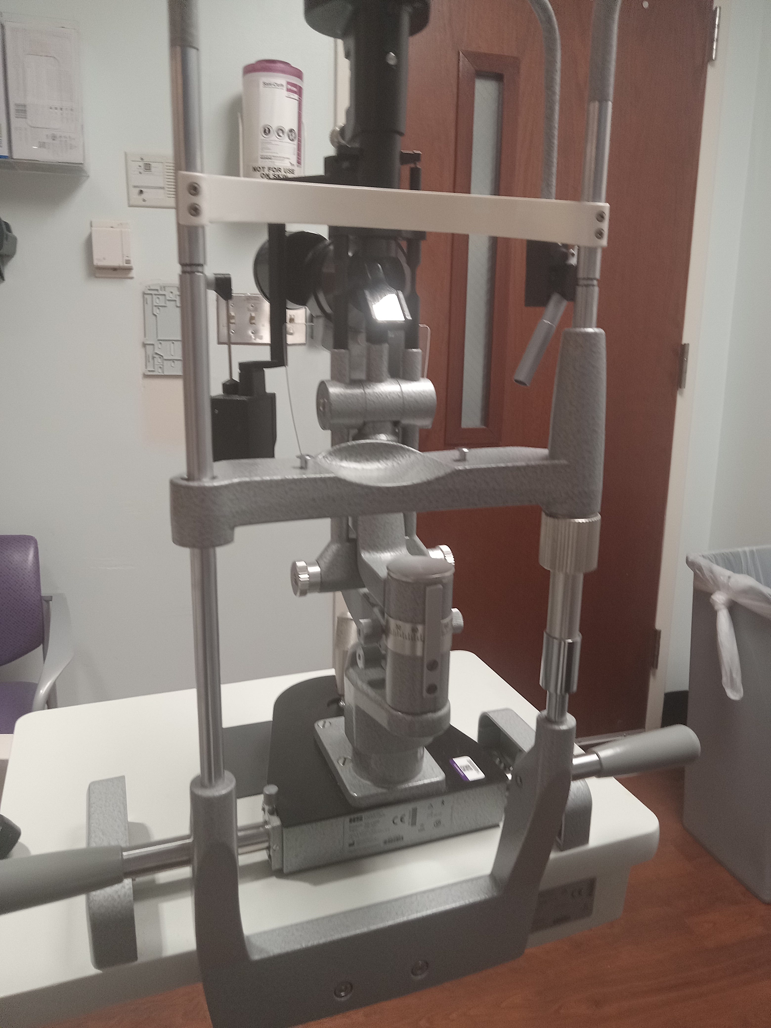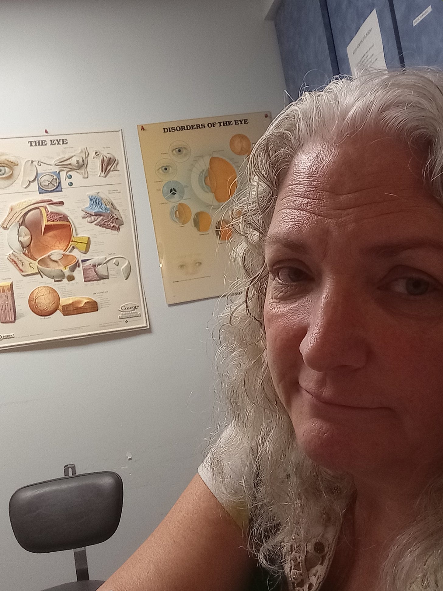 I updated Randy via text, thank you wifi. Eventually the nurse who stabbed me came to take me to the “eye room.” I followed the nice young man through a labyrinth of wooden hallways. We passed a nurses station and he had me take note of it in case it seemed like I was forgotten. He used the key pad to open a door at the end of a hallway and had me sit and wait for the eye doctor.