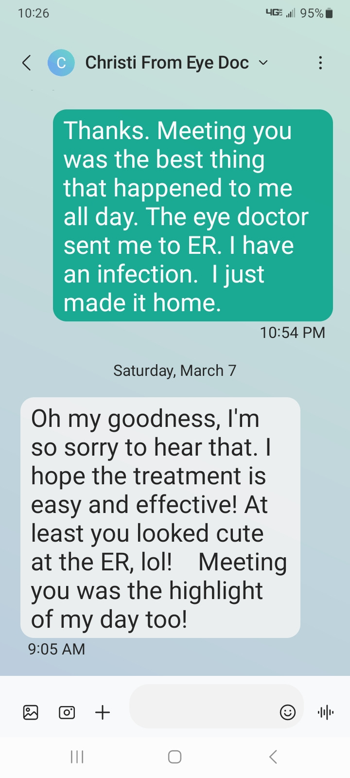 Going back Sunday for status check, but for now I am home with antibacterial and anti viral meds. At least I made a new friend.
